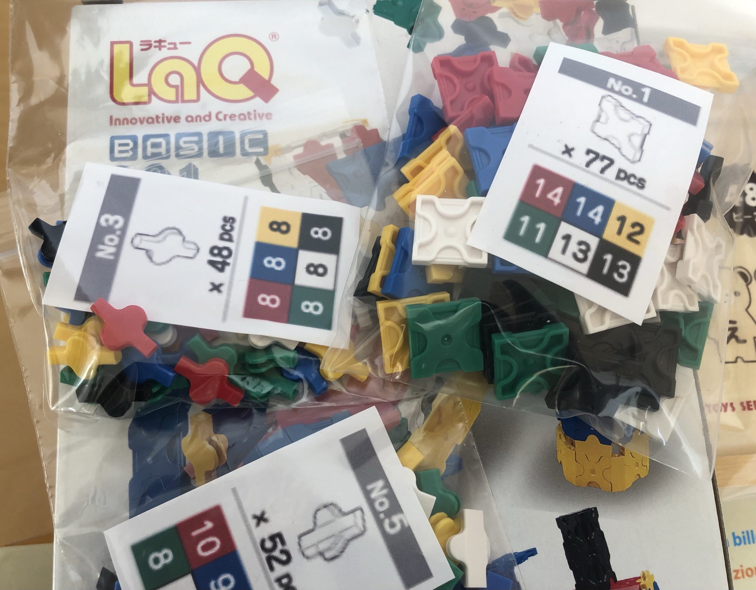 LaQは、このように形ごとに整理されて届きました。パーツが小さくて紛失しそうで結局子どもには渡せませんでした……